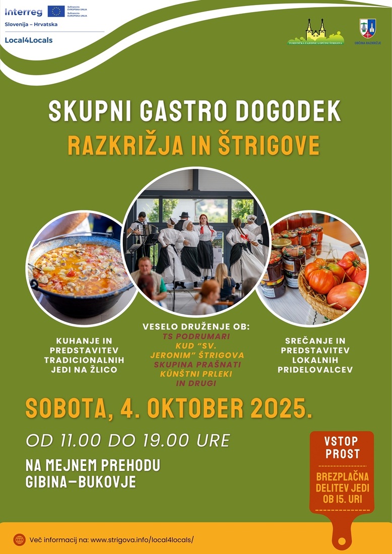 Projekt traja 8 mesecev. V tem času bomo vodilni partner Turistićka zajednica Općine Štrigova in partner v projektu Občina Razkrižje, organizirali 3 dogodke. Prvi je v soboto, 21. junija 2025 v Štrigovi, drugi dogodek v soboto, 6. septembra 2025 na Lokalni Eko Zdravi tržnici Občine Razkrižje in tretji dogodek v soboto 4. oktobra 2025 na Mejnem prehodu Gibina.